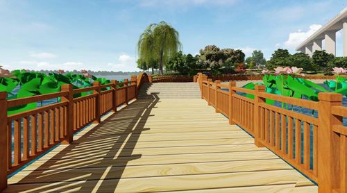 以荷花為主題,堤岸打造木棧道,河岸搭配蘆葦等植物,充分發(fā)揮綠地效益。
