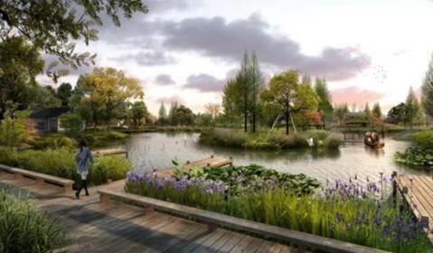 依托現狀地形地貌,打造親水平臺,結合用地規(guī)劃打造條狀小游園。